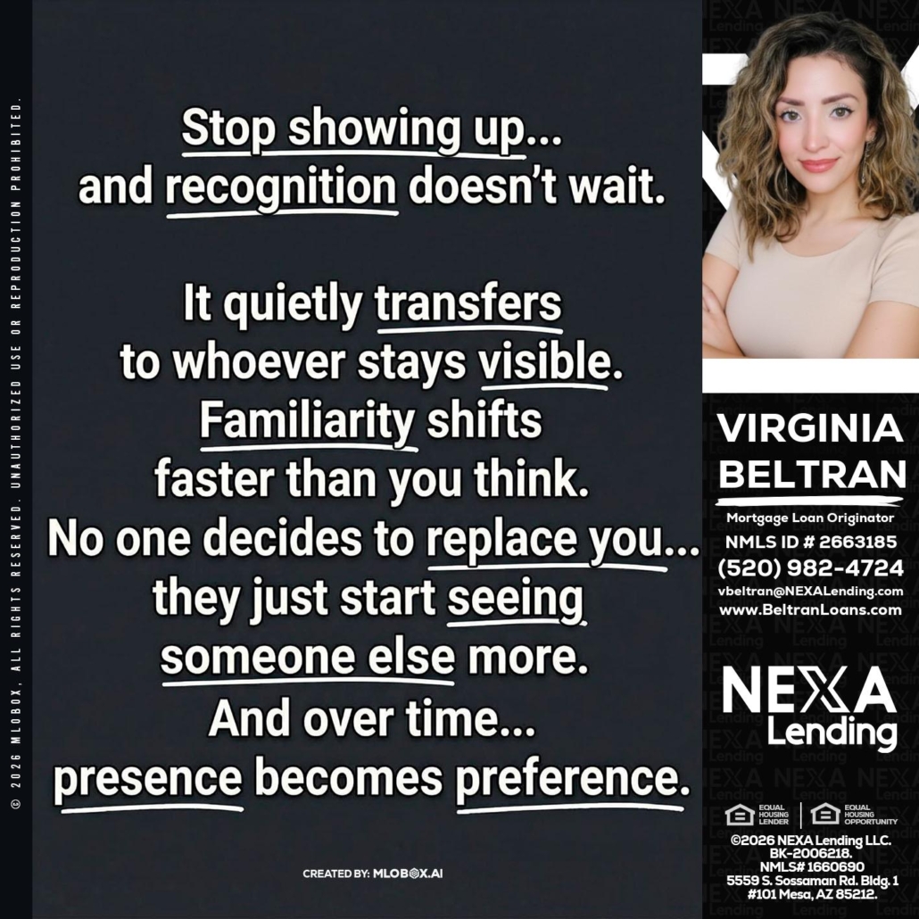 STOP SHOWING - Virginia Beltran -Mortgage Loan OriginatorHi, my name is Virginia Beltran. I’m a Loan Officer with NEXA Lending LLC., offering personalized mortgage solutions, fast customized quotes, great rates and service with integrity.